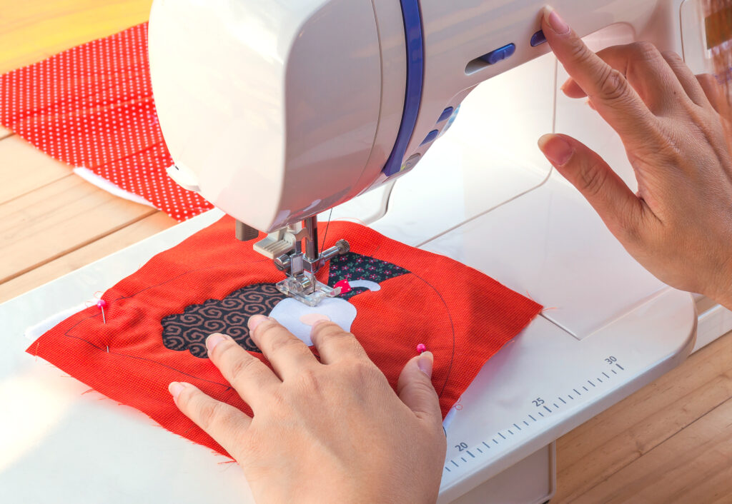 Woman’s hands, doing her patchwork using sewing machine